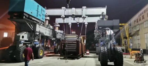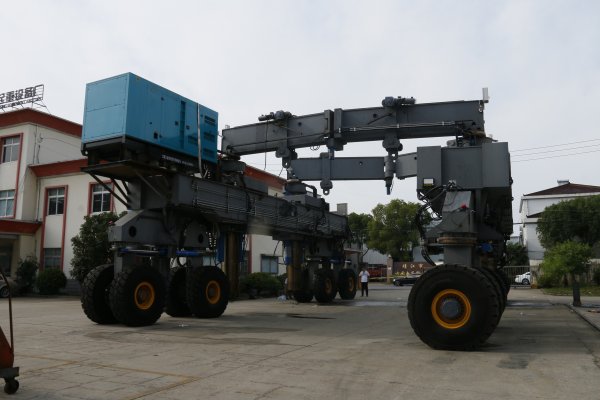首先从外形上看,这款龙门吊属于大型设备,客户要的这款不是常规的液压龙门吊,既可以行走,又可以折叠。看龙门吊上的轮胎,有16个,轮胎的高度也是比较高的,整台设备的整体高度高达4米多。