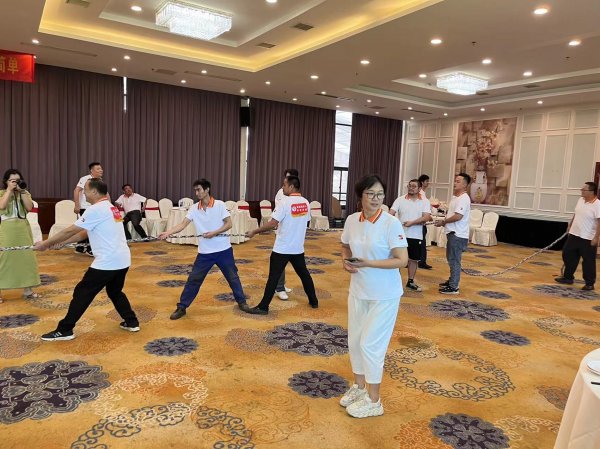 首先是大家准时抵达会场,然后依次排队,分别报数1-4,然后相同数字的伙伴们组成各自的队伍,分别选择一名队长与副队长,给本队选取队名与口号,然后小组合照,只能靠自己小队人员完成,根据完成时间及质量给予第一轮的评分。然后进入比赛活动环节,第一项是拔河比赛,这主要是靠实力说话的,每队选择8名成员上场,展开激烈的比拼。第二项是你表演我猜,每队8个成员,第一个根据看到的文字,通过肢体动作比划表演出来传给第二个小伙伴,依次向后,最后一个伙伴根据比划动作说出答案。第三项是动力火车,每个队友将右手搭在前面一个伙伴的肩上,抬起左脚,同时用左手去抓前面队友的左脚,以蹦跳的方式,看哪组先到达终点。最后一项是两人三足障碍赛,相邻两人的脚绑在一起,从起点走到终点,快的一组获胜。经过长达4小时的比赛,活动圆满完成,比赛过程中,充满了欢声笑语,当然,大家斗智斗勇,出谋划策,都努力着给本队争取更优异的成绩。