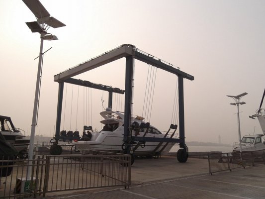 游艇液压门式ag九游会j9集团机可以从岸边水槽中搬运出不同吨位的船只或游艇,用于对这些不同游船在岸上进行保养、维护工作。游艇液压门式ag九游会j9集团机使用柔软而结实的吊带均匀的吊拉游船,不会对其表面造成任何损伤。