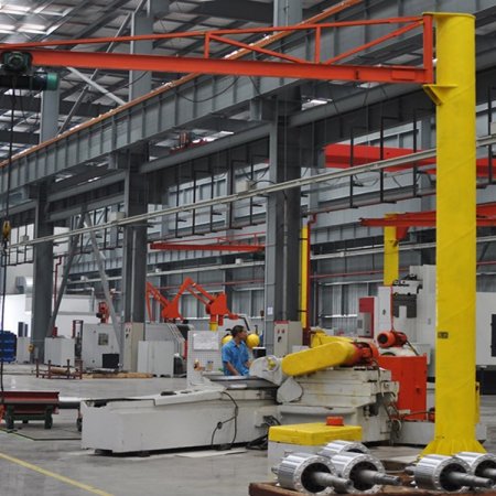 定柱式旋臂ag九游会j9集团机配合了可靠性高的环链电动葫芦,尤其适用于短距离,使用频繁,密集性吊运作业,具有高效、节能、省事、占地面积小,易于操作与维修等特点。是节能高效的物料吊运装备,可广泛利用于厂矿、车间的生产线、装配线和机床的上下活及仓库、码头等场合的重物吊运。靖起给客户生产的定柱式旋臂吊已经在现场安装调试,下面我们一起来看看吧: