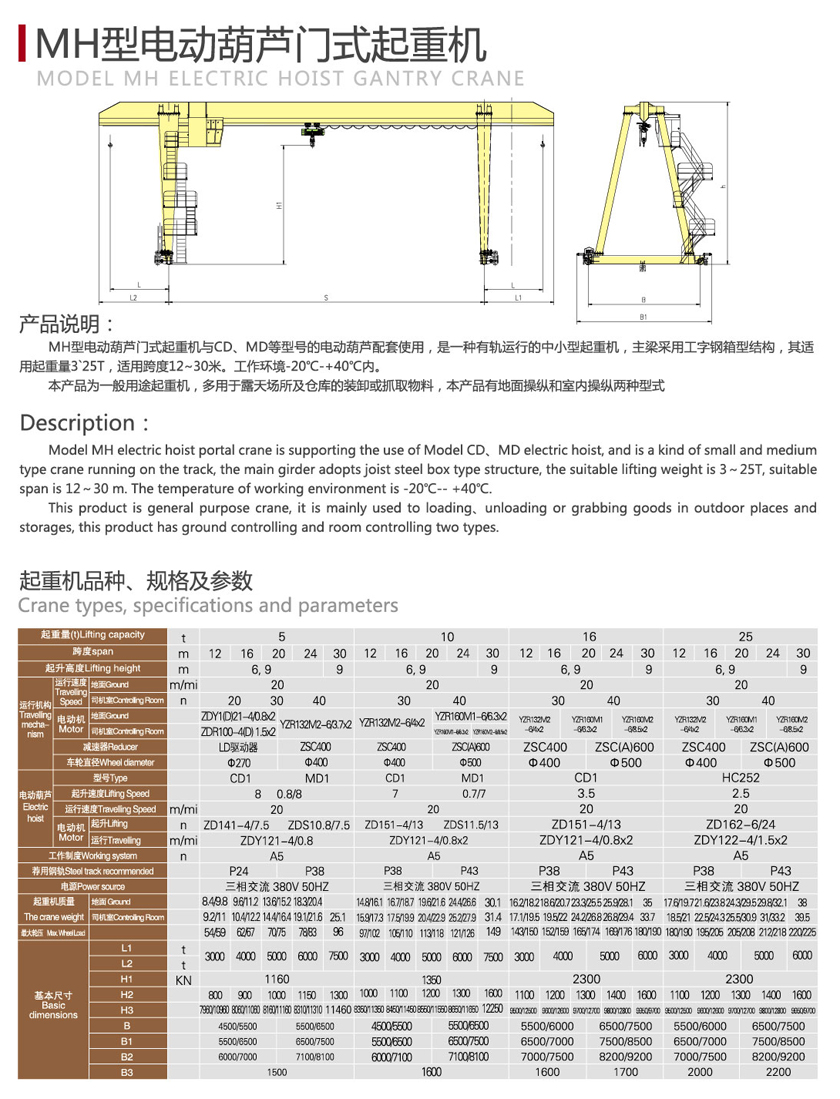 MH型电动葫芦门式ag九游会j9集团机与CD、MD等型号的电动葫芦配套使用,是一种有轨运行的中小型ag九游会j9集团机,主梁采用工字钢箱型结构,其适用ag九游会j9集团量3`16T,适用 跨度12~30米。工作环境-20℃-+40℃内。