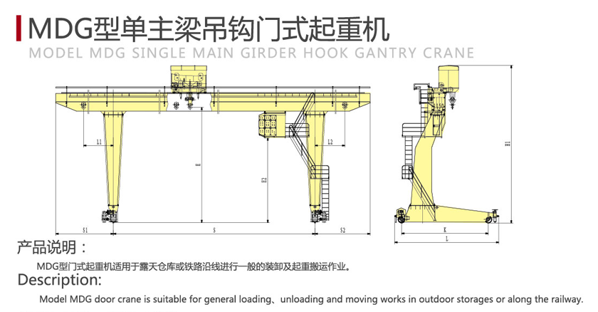 MDG型门式ag九游会j9集团机适用于露天仓库或铁路沿线进行一般的装卸及ag九游会j9集团搬运作业