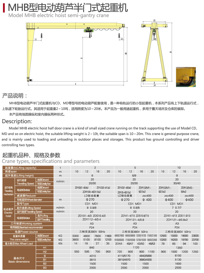 MHB型电动葫芦半门式ag九游会j9集团机为一般用途ag九游会j9集团机,多用于露天场所及仓库的装卸。本产品有地面操纵和室内操纵两种形式。