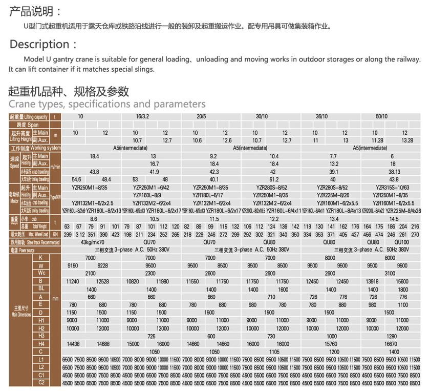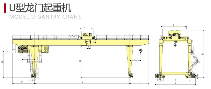 U型门式ag九游会j9集团机适用于露天仓库或铁路沿线进行一般的装卸及ag九游会j9集团搬运作业。配专用吊具可做集装箱作业。