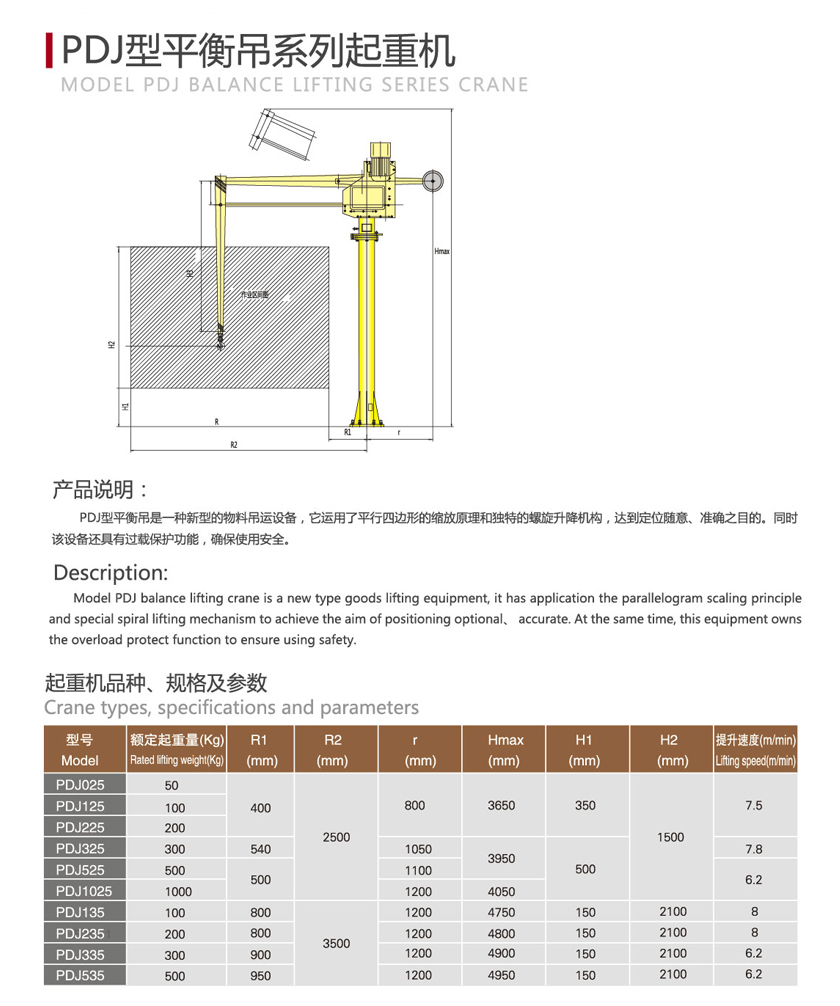 PDJ型平衡吊是一种新型的物料吊运设备,它运用了平行四边形的缩放原理和独特的螺旋升降机构,达到定位随意、准确之目的。同时该设备还具有过载保护功能,确保使用安全。