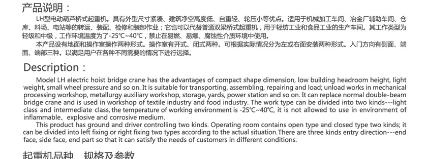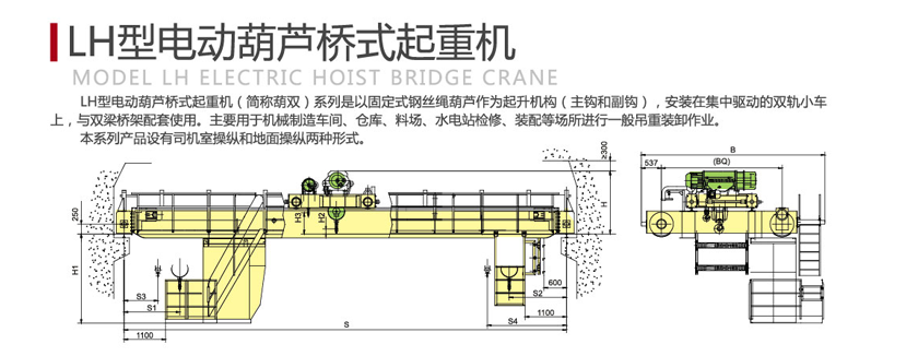 LH型电动葫芦桥式ag九游会j9集团机。具有外型尺寸紧凑、建筑净空高度低、自重轻、轮压小等优点。适用于机械加工车间、冶金厂辅助车间、仓库、料场、电站等的转运、装配、检修和装卸作业;它也可以代替普通双梁桥式ag九游会j9集团机,用于轻纺工业和食品工业的生产车间。其工作类型为轻级和中级,工作环境温度为了-25℃~40℃,禁止在易燃、易爆、腐蚀性介质环境中使用。