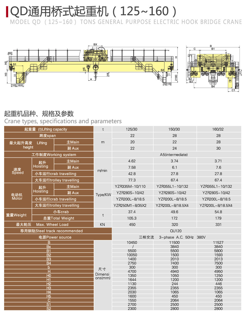 QD型通用桥式ag九游会j9集团机-行车属小车通用桥式ag九游会j9集团机,ag九游会j9集团机依靠沿厂房行车梁上支承轨道方向的纵向移动、小车的横向移动和吊钩的升降来实现工作流程、常用ag九游会j9集团量为5-50t,工作级别A5-A7级。操纵方式有地面控制、操纵室控制、遥控三种形式供用户选择。A5级适用于工作繁重程度不是很高的一般机械加工与装配车间、金属结构车间、机械维修车间等;A6、A7级适用于工作较为频繁或连续生产或连续搬运的场合,还可以作为冶金和铸造车间的铺助吊运;其使用环境温度在-20-40℃,相对湿度≤85%;另外A7级ag九游会j9集团量小于50t的在满足质检办特【2007】375号文件关于新出厂安装吊运熔融金属的ag九游会j9集团机要求的情况下可用于冶金和铸造车间吊运熔融金属,其使用环境温度为-20~60℃。本ag九游会j9集团机露天使用应注明,以便配套防雨装置