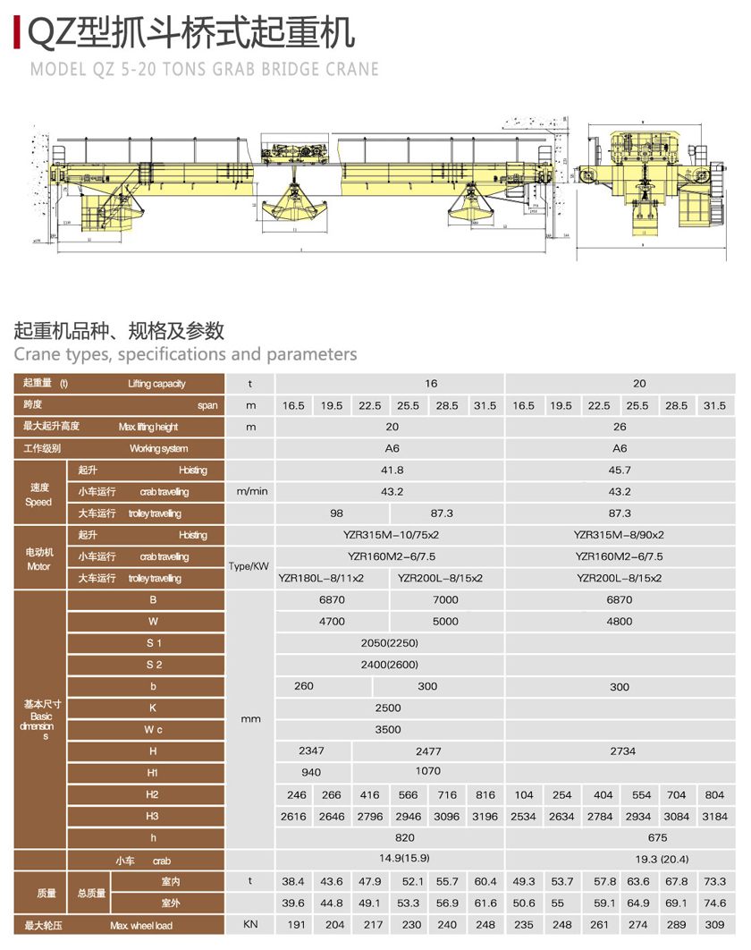 QZ型抓斗桥式ag九游会j9集团机广泛适用于电厂、货场、车间、码头等,进行散料的装卸运输。本ag九游会j9集团机均为重级工作制,工作级别为A6。全部机构均在司机室内操作。进入司机室平台门的方向有:端入、侧入、和顶入。额定ag九游会j9集团量包括抓斗自重。抓斗开启方向有平行和垂直主梁两种。取物装置为双卷筒的四绳抓斗,结构简单,工作可靠。抓斗可在任意高度张开和闭合。抓斗只适用于自然堆积状态下的散粒物料,当抓取水下物料或特殊物料时须在订货时特别提出。本ag九游会j9集团机可在室内也可在室外使用,室外使用时增加防雨罩装置。