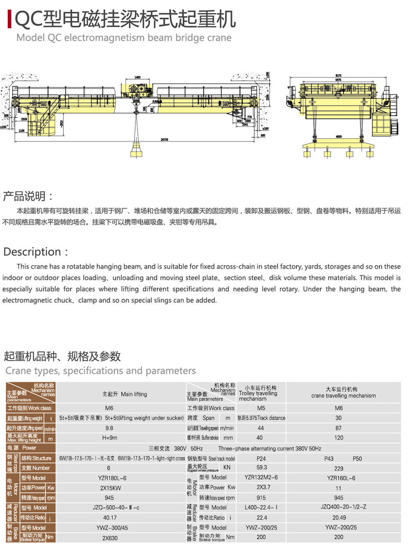 QC型电磁挂梁桥式ag九游会j9集团机带有可卸的电磁盘,特别适用于冶金工厂在室内或露天的固定跨间较繁重地装卸及搬运具有磁性的黑色金属制品与材料(如钢锭、型钢、生铁块)在机械厂、库房中也常用来搬运钢料、铁块、废铁、废钢、铁屑等物料。