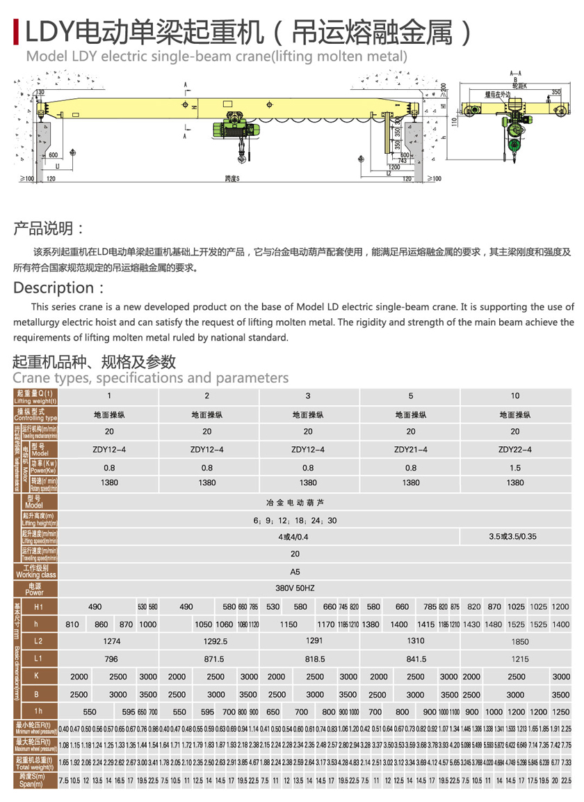 LDY电动单梁ag九游会j9集团机在LD电动单梁ag九游会j9集团机基础上开发的产品,它与冶金电动葫芦配套使用,能满足吊运熔融金属的要求,其主梁刚度和强度及所有符合国家规范规定的吊运熔融金属的要求。
